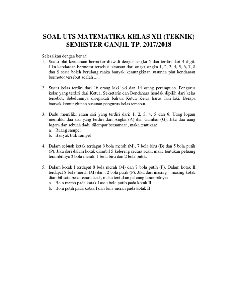 Soal Uts Matematika Kelas Xii Teknik Semester Ganjil 2017 2018 from imgv2-2-f.scribdassets.com We did not find results for: Maybe you would like to learn more about one of these? Check spelling or type a new query. Soal ujian tengah semester matematika kelas 12.
