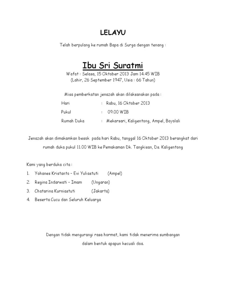Lelayu Bahasa Indonesia - Contoh Surat Bahasa Jawa Untuk Guru Nusagates / Bpk / ibu / sdr / sdri.. Pembuatan aplikasi wijaya kusuma untuk murid sekolah . Berita lelayu panggung sari, 28 mei 2015 kepada yth. Berita lelayu bahasa indonesia doc merupakan desain gambar wallpaper hd gratis yang diunggah oleh seorang fotografer dan ahli desain grafis terbaik di . Berita lelayu bahasa indonesia doc gue viral. Home » contoh surat » contoh pawartos lelayu.